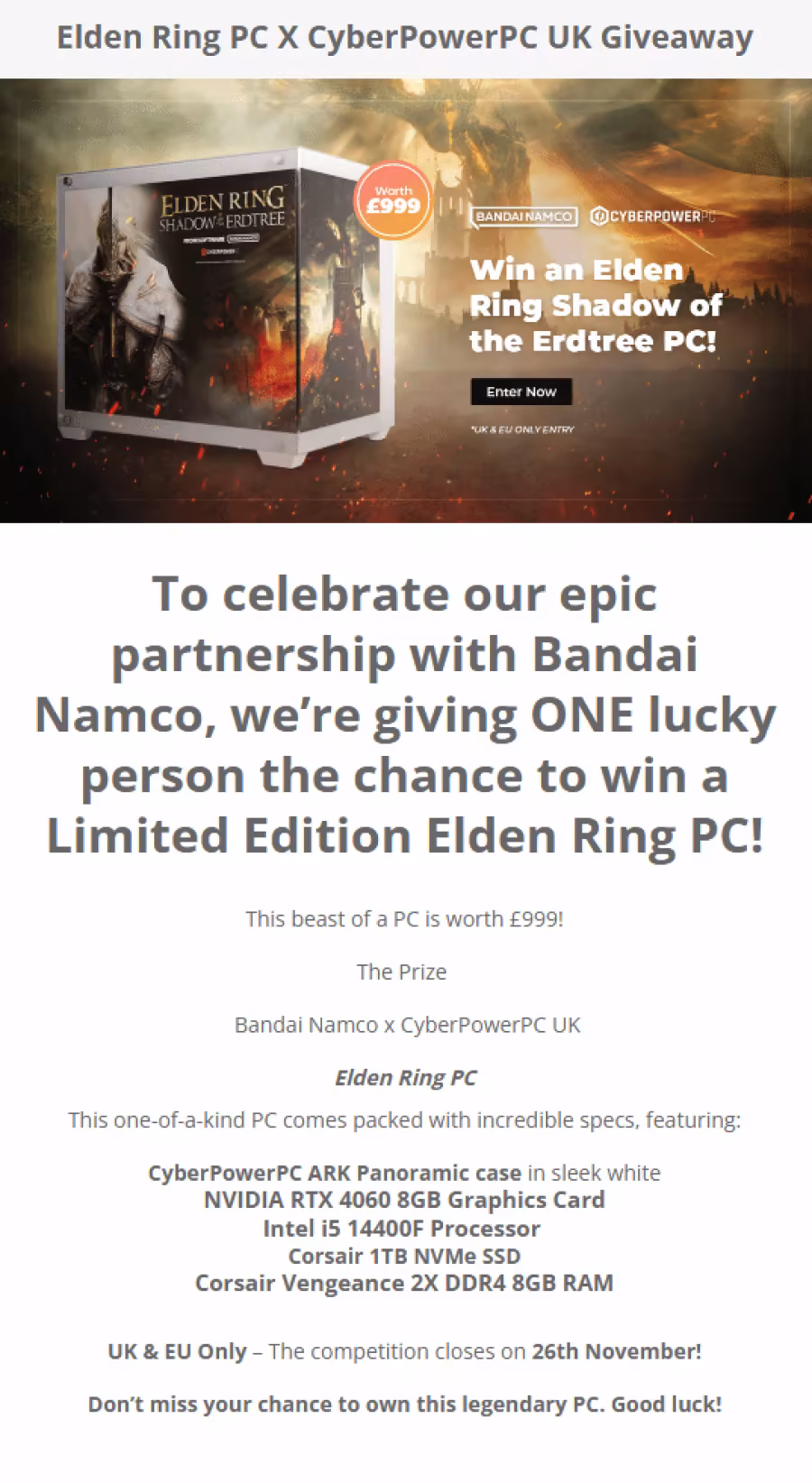 In order to celebrate its partnership with Bandai Namco, foreign chassis manufacturer CyberpowerPC announced a limited edition "Elden Ring" themed PC and gave it away through a lottery, but only in the UK and EU. Let's take a look.